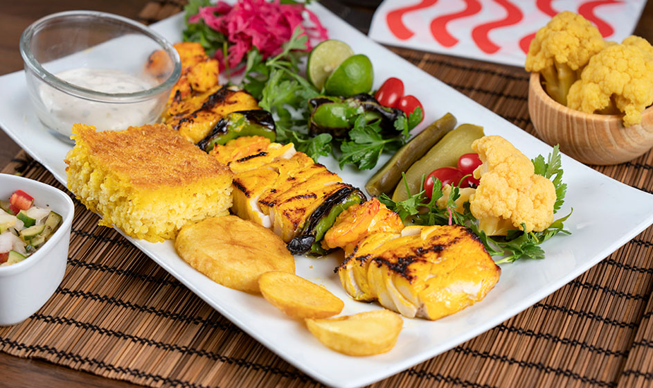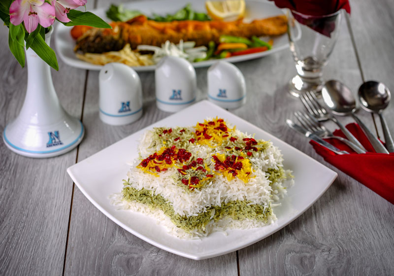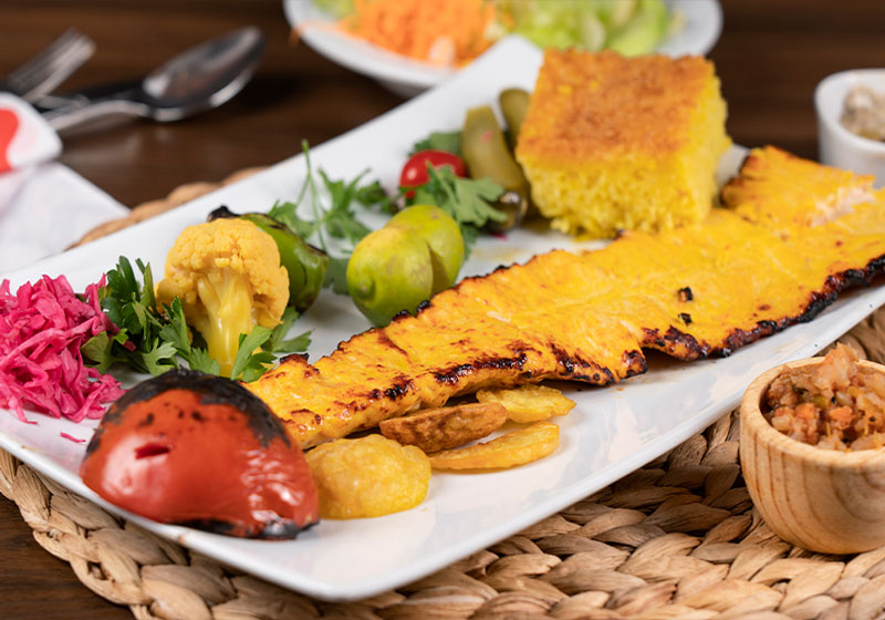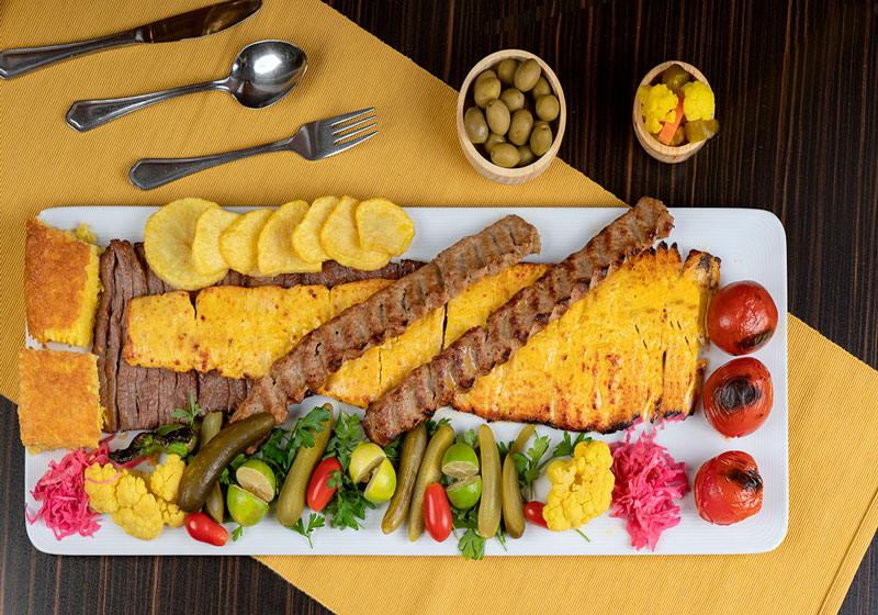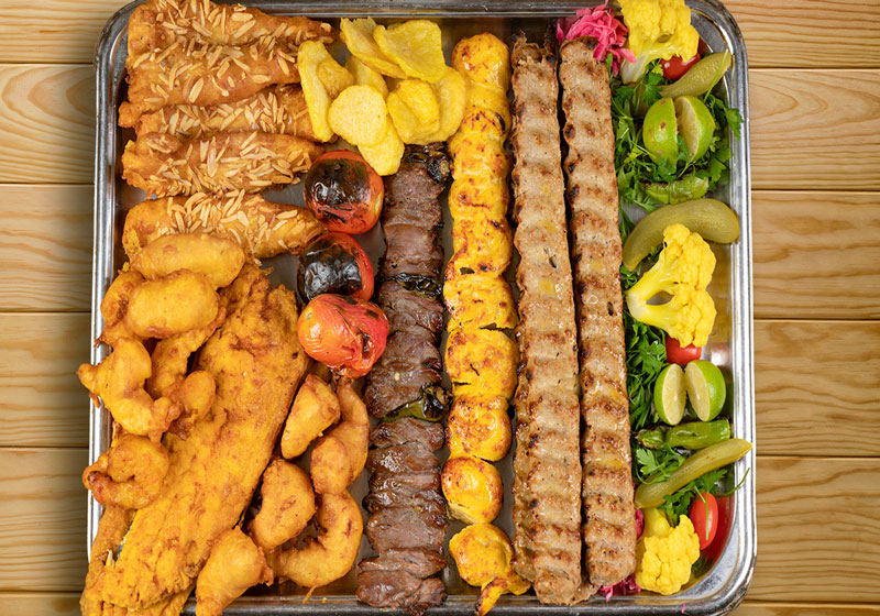 چهـارسیـخ کبـاب کوبیـده ، یـک سیـخ بره کبــاب،یک سیخ جوجه کباب حلزونی ،یک پرس میگو سرخ شده ،یک پرس ماهی قزل آلا ،یک پرس جوجه چینی و دورچین