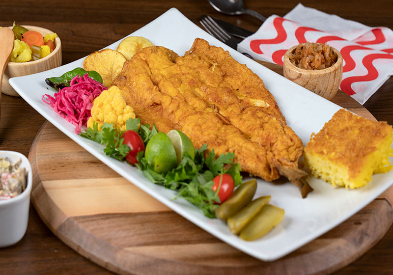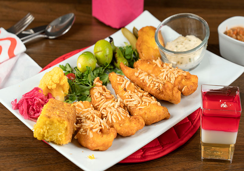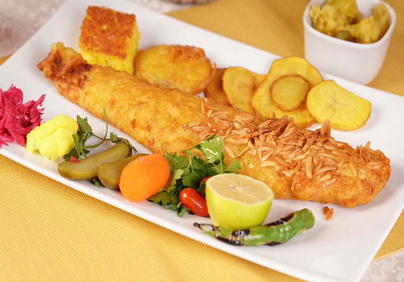 ماهی شوریده سرخ شده با خمیر بنیه و خلال بادام و دورچین